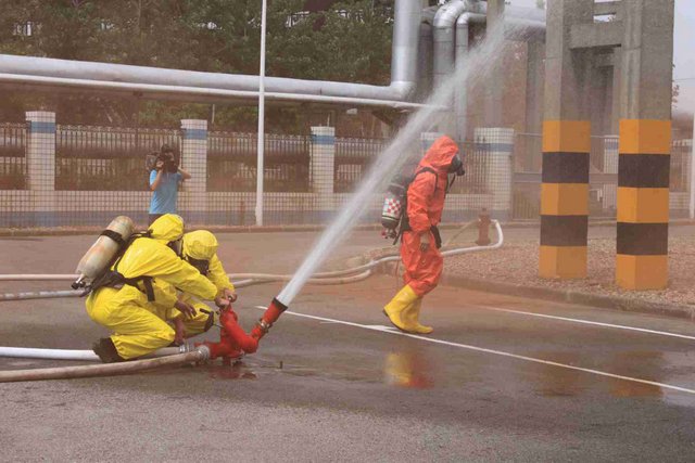 由于氯氣是具有刺激性氣味的有毒氣體,可以溶解于水,因此應急處理主要是通過噴灑形成水霧的方法來降低氯氣濃度,控制擴散范圍。現(xiàn)場用紅色煙霧代替黃綠色氯氣。演練中,市安監(jiān)、公安、消防、環(huán)保、質監(jiān)、衛(wèi)生、氣象等部門積極聯(lián)動,各司其職,氣象部門提供風力、溫度、濕度等實時數(shù)據(jù),環(huán)保部門負責空氣中氯氣含量檢測,公安負責交通管制和疏散救援……僅用了不到40分鐘即圓滿完成了泄漏源堵漏和周邊企業(yè)及居民的疏散工作,充分展示并檢驗了市政府、職能部門及企業(yè)應對危險化學品事故的應急處置能力。