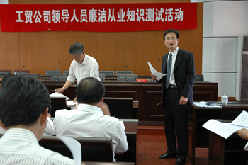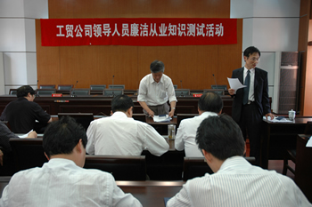 最近一段時(shí)期,南通工貿(mào)公司黨委組織中層以上干部認(rèn)真學(xué)習(xí)國資委編發(fā)的《國有企業(yè)領(lǐng)導(dǎo)人員廉潔從業(yè)工作手冊(cè)》。為檢查學(xué)習(xí)效果,公司紀(jì)委于2007年5月18日下午舉行“工貿(mào)公司領(lǐng)導(dǎo)人員廉潔從業(yè)知識(shí)測(cè)試活動(dòng)”,中層以上干部16人參加,均取得較好成績(jī)。