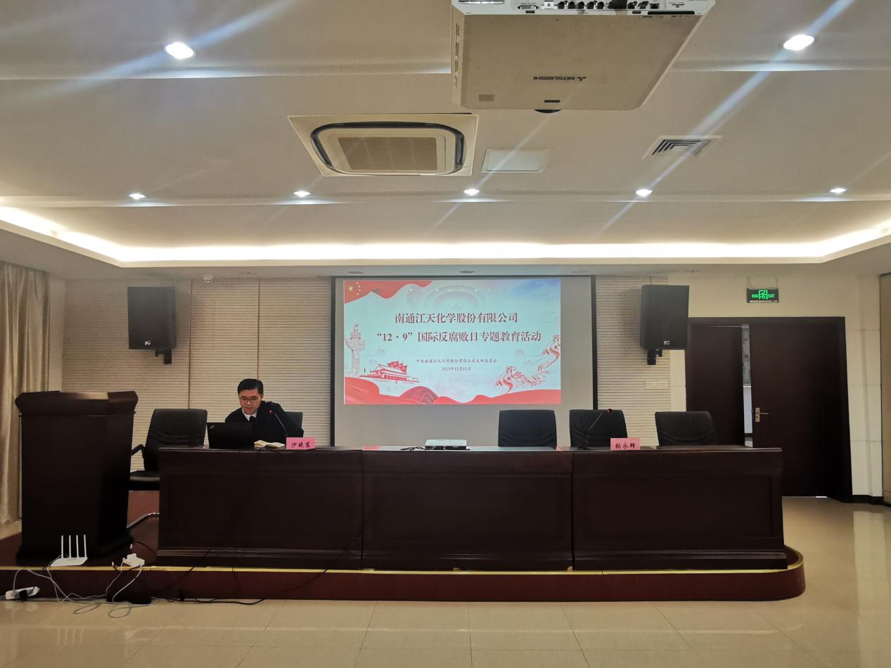為持續(xù)筑牢公司廣大黨員干部群眾廉潔從業(yè)風(fēng)險(xiǎn)底線意識(shí),12月11日下午,南通江天化學(xué)股份有限公司黨支部組織召開“12·9”國(guó)際反腐敗日專題教育活動(dòng)。會(huì)議由黨支部書記、副總經(jīng)理張永鋒主持,公司全體黨員、管理人員及相關(guān)部門人員參會(huì)。